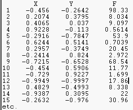 The table shows the numbered XY-coordinates and function values which can not be edited in this test version of the program. By marking the check boxes Points and Numbers on the Show sheet all numbered points will be drawn into the 2D-Image.